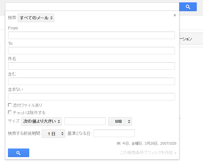 Gmailの検索枠右端の▼をクリックすると表示される詳細設定メニューでもいろいろ検索出来るようになってました。こちらもかなり便利ですね。