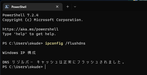 「DNS リゾルバー キャッシュは正常にフラッシュされました」と表示されたら、DNSのキャッシュが削除されています。