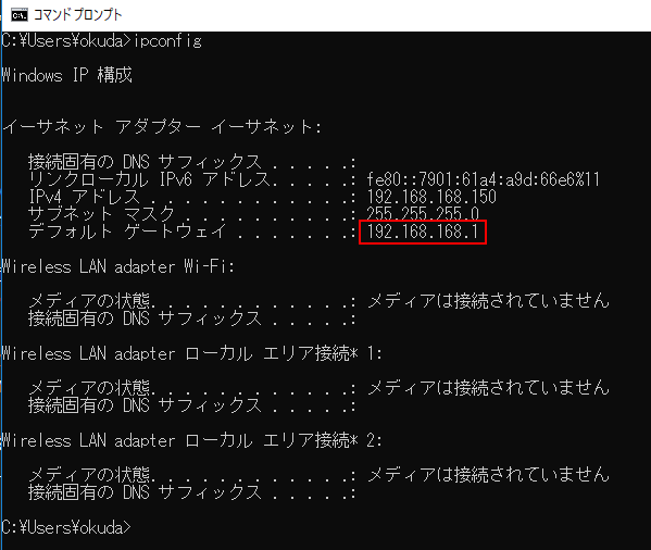 通常は上記の方法で表示されますが、会社などでルーターの設定を変更している場合は上記の方法で接続されません。その場合はコマンドプロンプトを使ってルーターの場所を確認する必要があります。