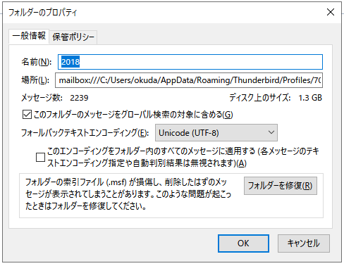 Thunderbird(サンダーバード)では、フォルダ内の全てのメッセージが1つのファイル(MBOXファイル形式)で保存されています。そのフォルダの容量上限が4GBです。4GBを超えるとこのようなメッセージが表示されます。