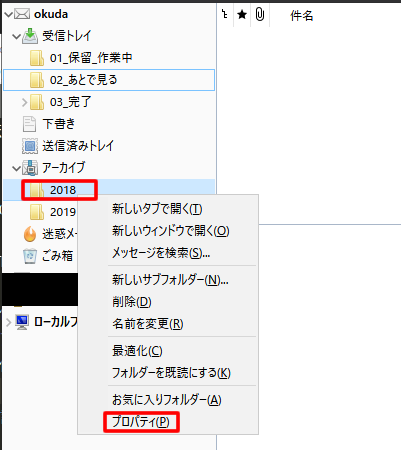 メールボックスの容量を確認するには、該当フォルダを右クリックして、プロパティを確認してください。