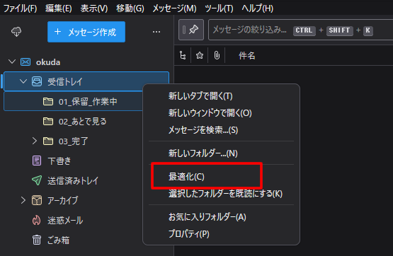 最後にフォルダの最適化を行ってください。 最適化を行わないと容量は少なくなりませんのでご注意ください。