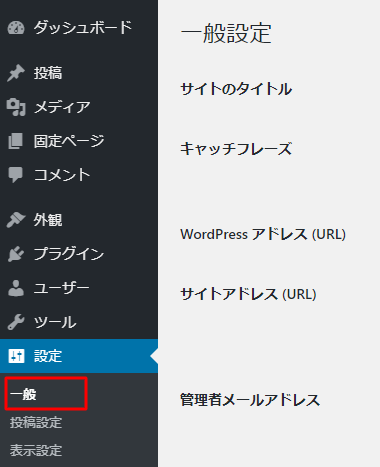 WordPressの管理画面の左メニュー「設定」をクリックし、その中の「一般」をクリックしてください。