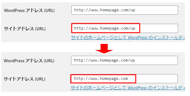 なお、「WordPress アドレス (URL)」はWPをインストールした場所なので、間違って変更しないようにお願いします。