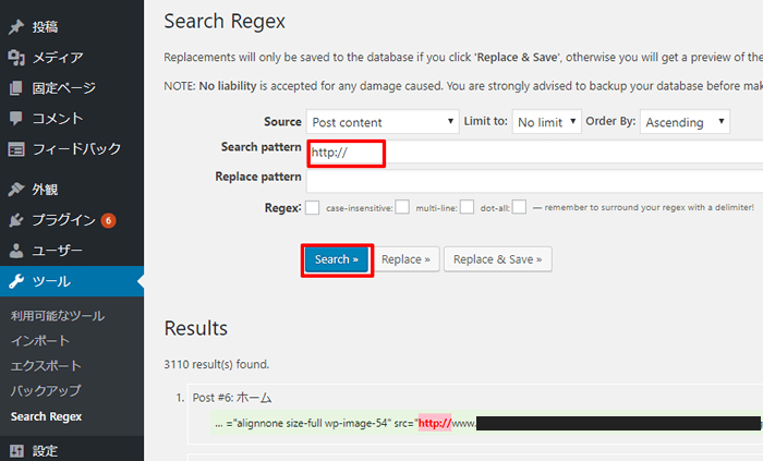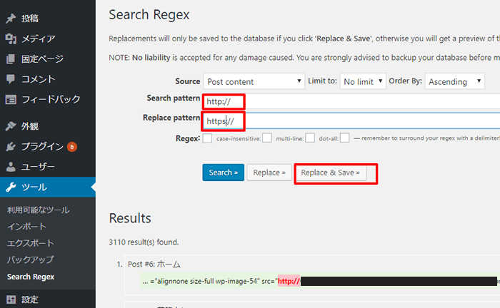 Wordpressのプラグイン Search Regexを使って「http」部分を「https」に置換します。