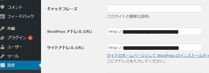 WordPressの管理画面の設定で、 Wordpressアドレス(URL)とサイトアドレス(URL)に記載されている URLの「http」部分を「https」に変更します。